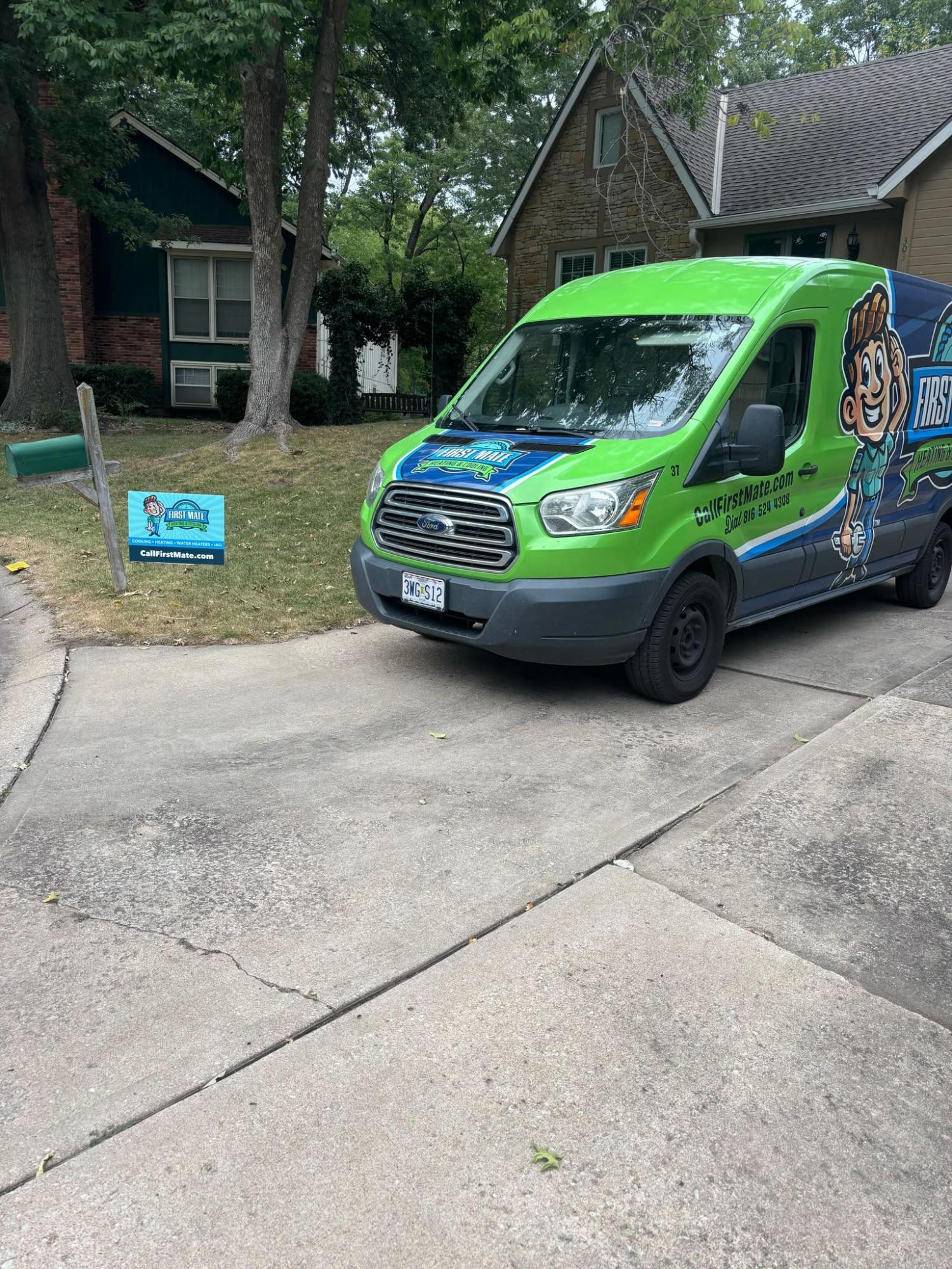 First Mate Heating & Cooling van and yard sign at a home in Lee's Summit