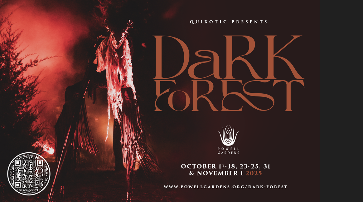 Quixotic Presents DARK FOREST at Powell Gardens | October 17 - November 1 Back to Member News Items Quixotic Presents DARK FOREST at Powell Gardens | October 17 - November 1 By Sharon Ramsey 10/21/2025 Images × Share × Email Facebook LinkedIn X Pinterest Powered By GrowthZone